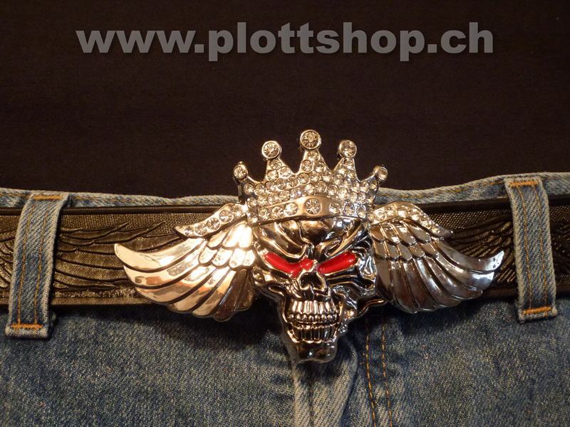 Buckle Skull red eyes, Crown, Wings, chromfarben, Krone, Totenkopf, Totenschädel,